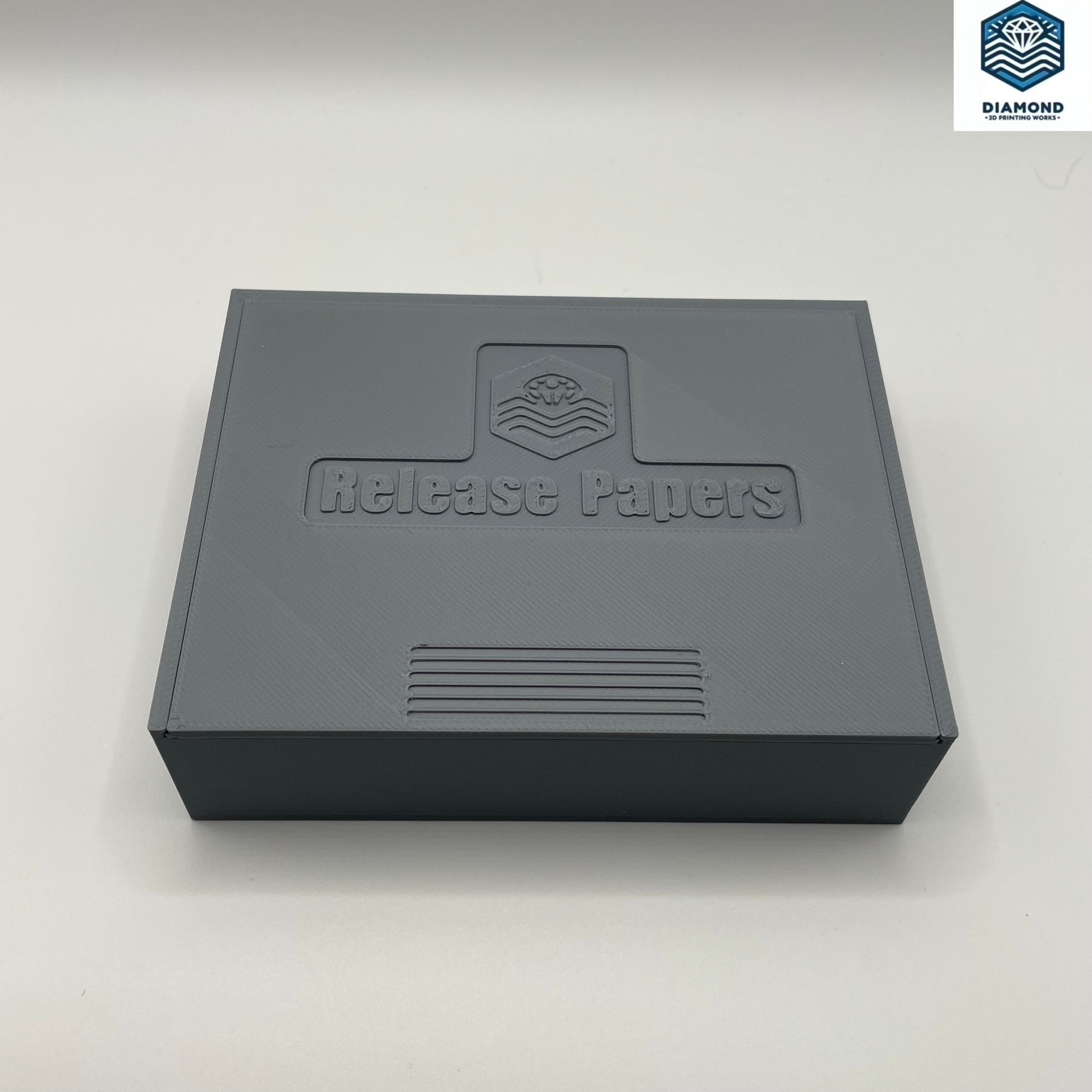 Our release paper cases have no frills, no gimmicks, and no complications. Stylish and compact. The looser tolerance slide cover is so easy to open and close, you can do it with one hand. No more fumbling laying down papers while kitting up or working. For best results, place papers in the case with working (shiny) side facing up. Effortlessly grab single or multiple papers from the case using a pinching motion. When not in use, these cases take up minimal space when laid on their long side (see picture). If you are looking for a reliable, easy to use storage solution for your release papers look no further. Diamond 3D Printing Works has the performance you want, at a down to earth price!