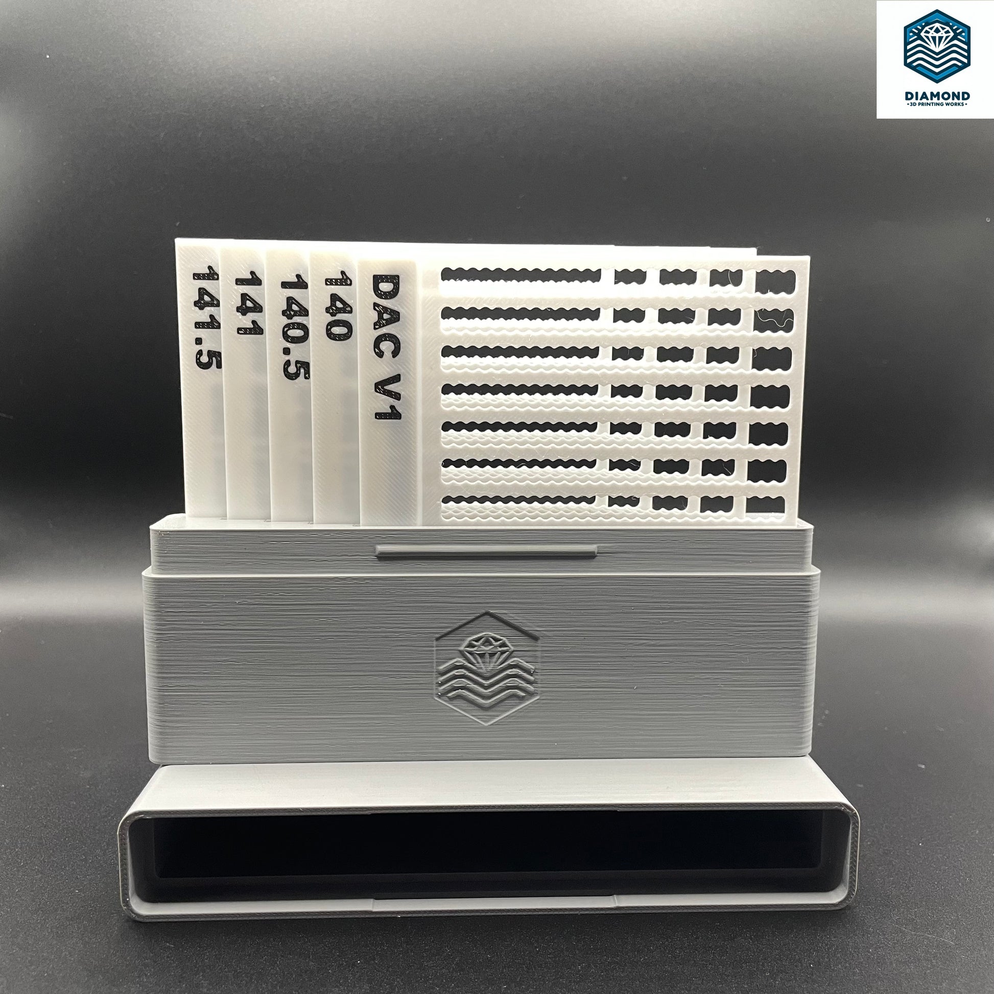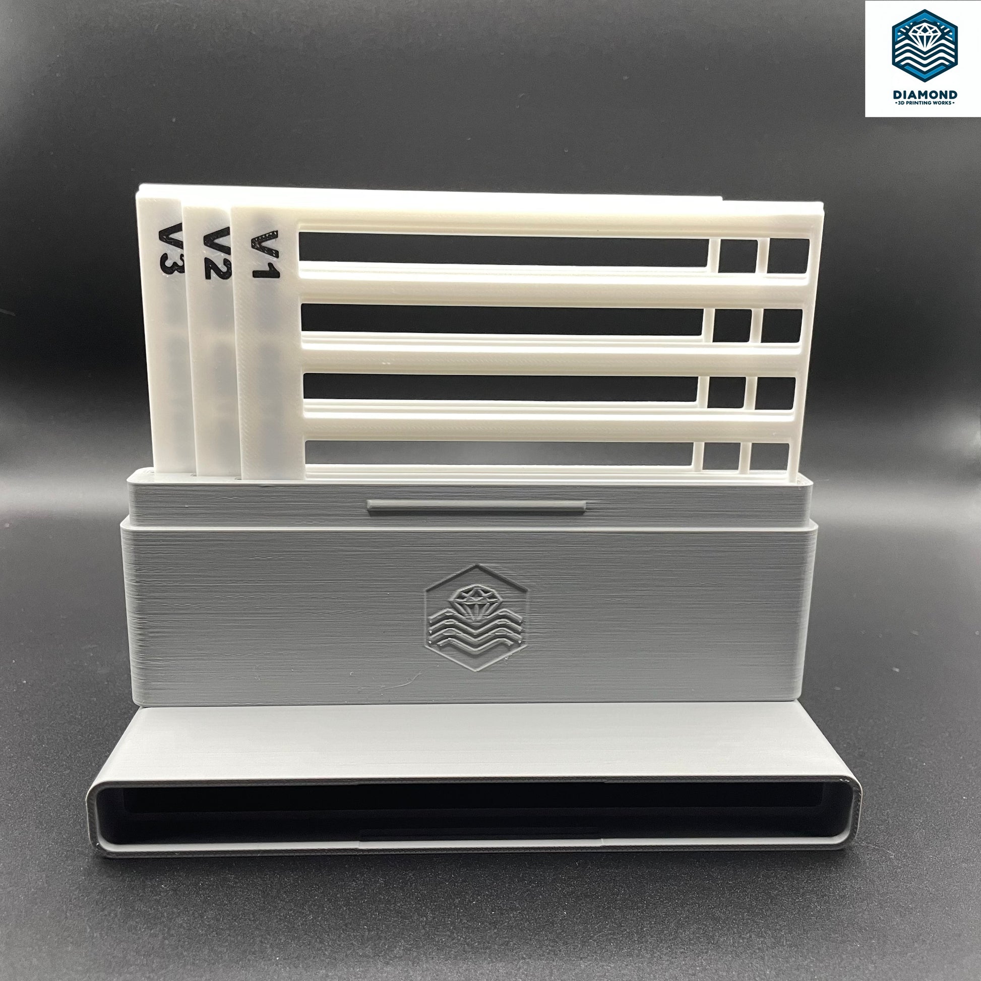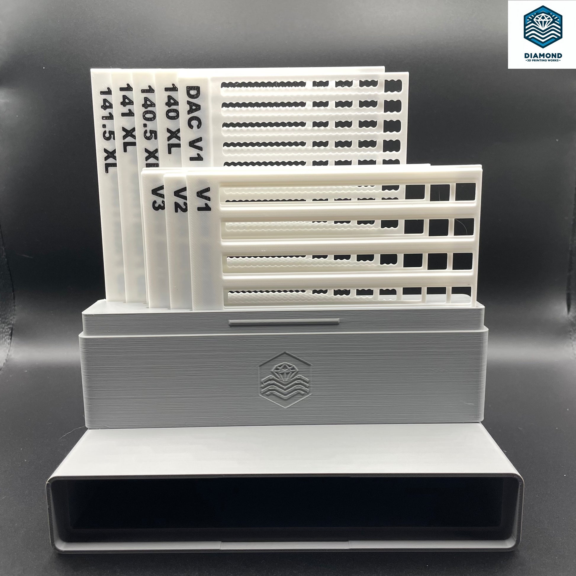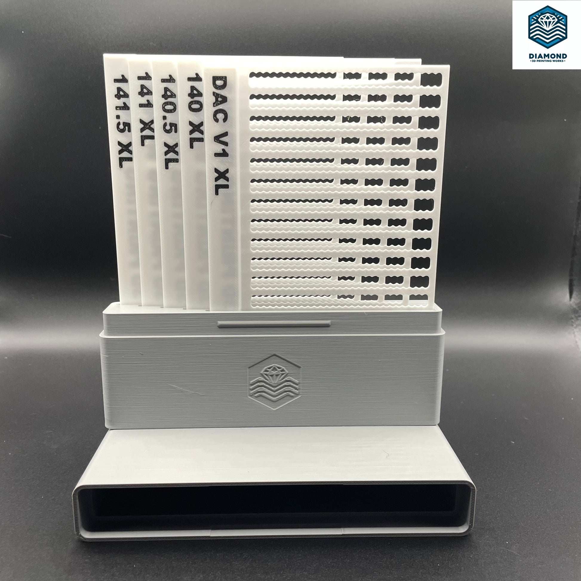 Each case features a base with logo on both sides, and separate lid. Round snap latch design keeps lid securely closed, yet easy to open. The index layout provides easy ruler identification and access. Cases are compatible with all Diamond 3D Printing Works round and square ruler types!